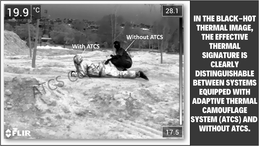 An Advanced Thermal Camouflage System is a specialized attire or protective clothing designed for military or tactical use. Its primary function is to reduce and manage the thermal signature emitted by a person wearing the suit. This is achieved through the use of advanced materials and technologies that aim to make the wearer less detectable by Long Range Infrared sensors.